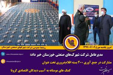 مدیرعامل شرکت شهرک های صنعتی خوزستان بیان داشت، بر اساس منویات و فرمایشات مقام معظم رهبری در پی شیوع و گسترش ویروس کرونا در سطح کشور و توجه به اقشار آسیب پذیر جامعه با مشارکت و همدلی صنعتگران و تلاشگران عرصه صنعت این شرکت در امر خداپسندانه جمع آوری ۴۰۰ بسته اقلام ضروری تحت عنوان کمک های مومنانه شرکت کردند . مشارکت در جمع آوری ۴۰۰ بسته اقلام‌ ضروری تحت عنوان کمک های مومنانه به آسیب دیدگان اقتصادی کرونا