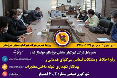 مدیرعامل شرکت شهرک‌های صنعتی خوزستان خواستار شد : رفع اختلاف و مشکلات فیمابین شرکتهای خدماتی و پیمانکار نگهداری شبکه داخلی مخابرات شهرکهای صنعتی شماره ۳ و ۴ اهواز